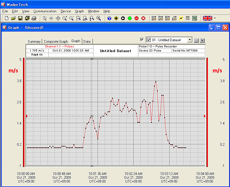 測定したデータは、Windows対応の解析ソフトで数値・日時表とグラフ・日時表で表示します。最高・最低・平均風速も見ることができます。解析ソフト中のExcelアイコンをクリックすることで測定データをExcelでも表示できます。風速単位はマイル/時やノット等の単位に変更することも可能です。