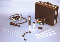 | <操作モード> ●スキャン・モード 各種のアコースティック・プローブをそのレシーバーの取付けて使用。 ■雑音の多いプラントでもすばやく正確に真空漏れ・圧縮空気漏れを簡単に検知。維持管理経費を削減、エネルギーコストのムダも早期発見。 空気、蒸気またはプラント・ガスの、微少なものから大きい圧力漏れの位置を正確に指摘するために聞き取れる雑音を通して抽出する ![]() ●コンタクト・モード 長さの選択が可能なソリッド・プローブをレシーバーの先に取付けて使用。 ■ベアリングとギアの作動状態を瞬時に把握 ■チェック・バルブと水圧の円柱に内部オイルまたは空気漏れを検知、空洞現象を診断 ■大きな雑音のあるプラント内の状況でも、欠陥のあるバルブの位置を正確に指摘 ■装置欠損の前に、欠陥のあるソレノイドバルブを発見 ![]() ![]() ●トランスミッター(発信機)とスキャン・モード 超音波信号を発信して非加圧容器または空腔部を超音波で満たし、シール、ガスケット、溶接部等の密閉不良部分を通じて逃げ出す超音波を検出。密閉不良の位置は容易に特定。 ■水圧検査に変わり、トランスミッターからの超音波でタンク内の気密性を検査 ■煙を使った検査は不要。超音波でシールやガスケットの気体漏れも穴の箇所を正確に指摘。 ![]() | |||||||||||||||||||||||||||||||||||||||||||||