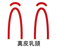 | 組織の血流が悪くなっていると考えられる。医師の診断が必要と思われる。 | 新陳代謝の良い人は血管に先の上に必ず真皮乳頭があり、鮮明にわかる。 |