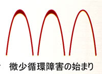 | 血管が硬くなってもろくなっていて、肩こりや各所の痛みをともなうことが多い。頭痛、頭が重いなどの症状が出ることもある。 | 血管の先端部が見えるだけで、他はほとんど見えない。食事面などを注意し、体質改善に努めることが大切。 |