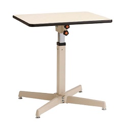 脚部のペダルを踏み込みながら、テーブルを水平に引き上げ(または押し上げ)、任意の位置でペダルを離すとその位置でテーブルがロックされるフリーロック機構のワーキングテーブルです。